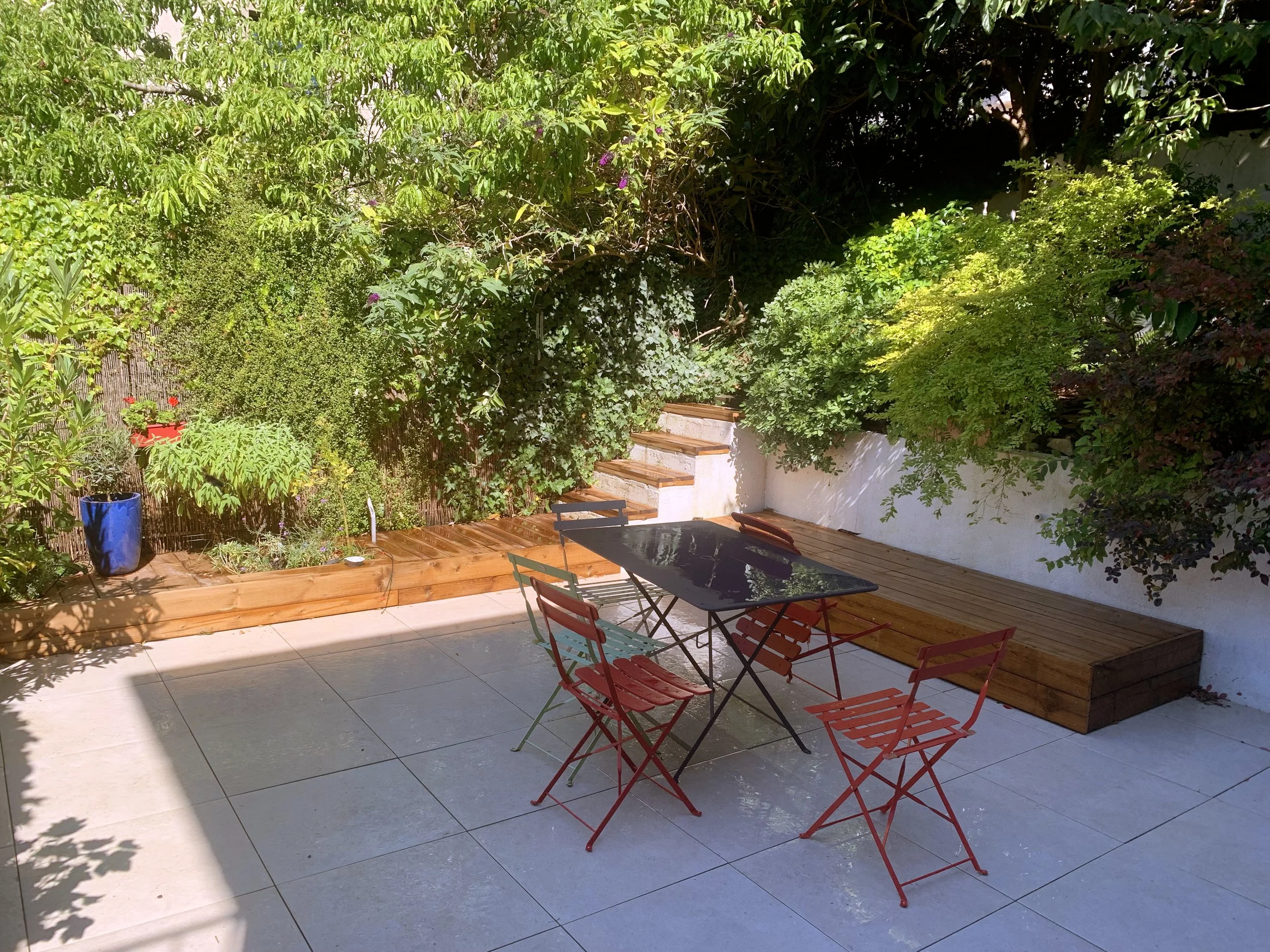 Cette terrasse en grès cérame sur plot à permis de retrouver un sol plat, lumineux, doux au toucher et facile d’entretien. Les Decks ou estrade on été remis à neuf. Je les avais dessiné et realisés pour les anciens propriétaires de la maison, Chloé et Olivier … Dix ans plus tôt. Un système d’arrosage permet aux massifs et poteries d’être arroser si besoin. Celine et Robin peuvent partir en vacances sans craindre qu’une canicule vienne détruire leurs végétaux.