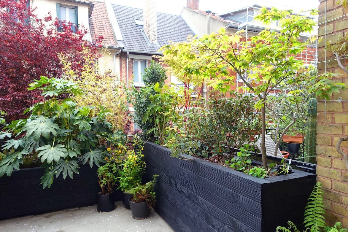 Laurence voulait mettre de l’ordre sur cette petite terrasse parisienne. Le principe était de garder l’esprit de ses dizaines de poteries toutes de couleurs sombres. Le noir est une couleur qui fait particulièrement ressortir les tons verts des végétaux. Avec l’aide de Sophie Dufour nous avons fait une sélection des végétaux existants que nous voulions conservés et avons sélectionné en pépinière un ensemble de végétaux qui fasse office de brise vue.